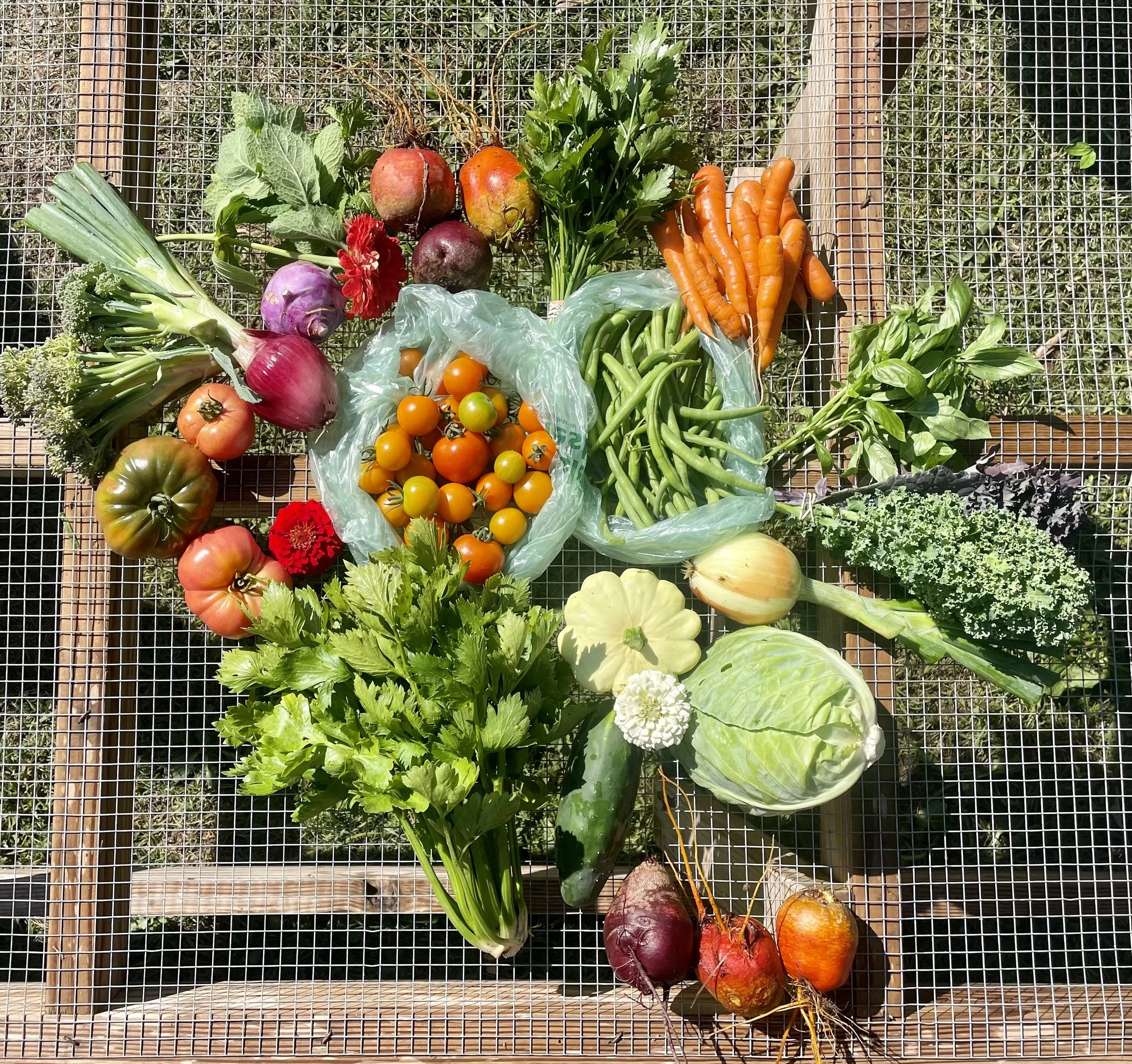 We grow a seasonal mix of vegetables—from crisp greens and juicy tomatoes to vibrant root crops and hearty squash—depending on what’s thriving in the fields each week. Our farming practices prioritize soil health, sustainability, and transparency, so you can feel confident in every box you receive.